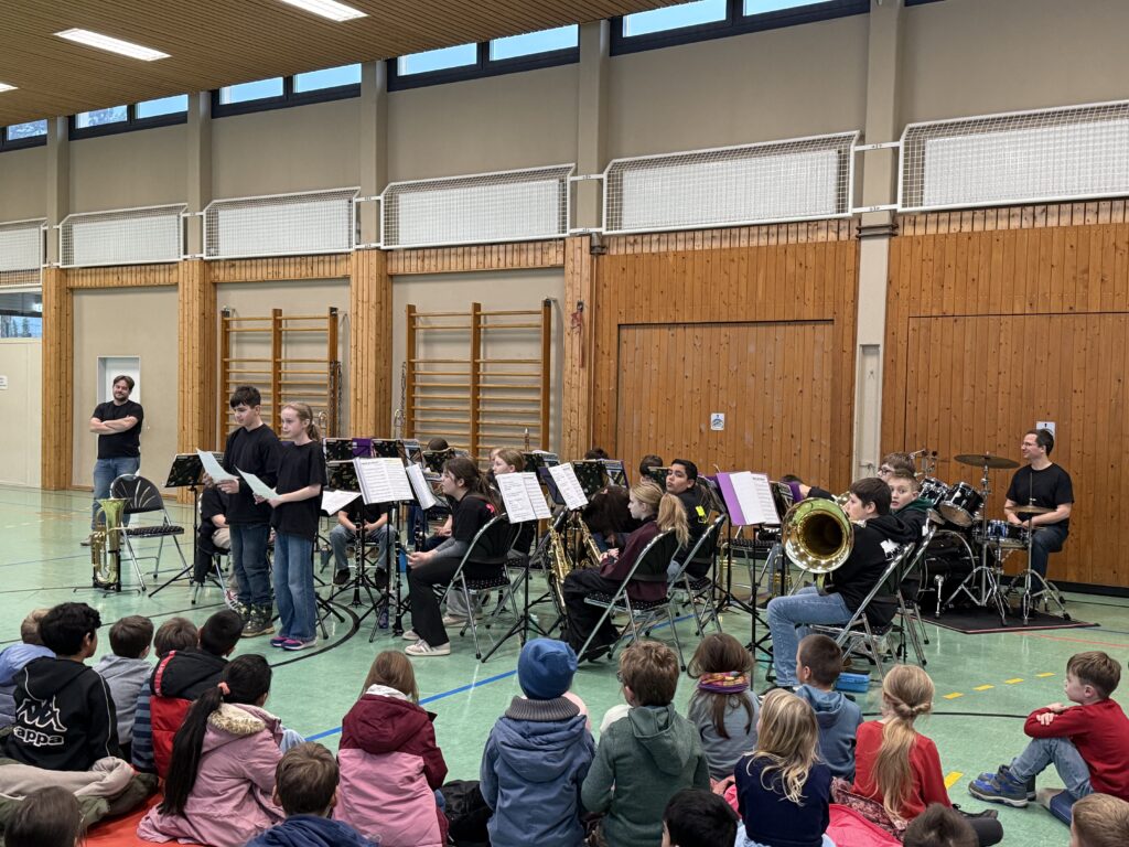 Am gestrigen Dienstag besuchte uns die 6. (Bläser-) Klasse der Realschule + aus Oberwesel und gab, schon traditionell kurz vor Weihnachten, ein Konzert in der Turnhalle für die gesamte Schulgemeinschaft. Faszinierend wie toll die Kinder bereits nach eineinhalb Jahren ihr Instrument beherrschen und in einem großen Orchester viele tolle Stücke und Lieder präsentierten. Besonders schön ist es zu sehen mit welchem Eifer und Erfolg immer auch einige ehemalige Schülerinnen und Schüler dabei sind. Die 4. Klassen hatten nach dem Konzert die einzigartige Möglichkeit die verschiedenen Blasinstrumente auszuprobieren. Vielen Dank an die Oberweseler Musikanten rund um ihre Lehrerin und Dirigentin M. Höfer für dieses musikalische Highlight.