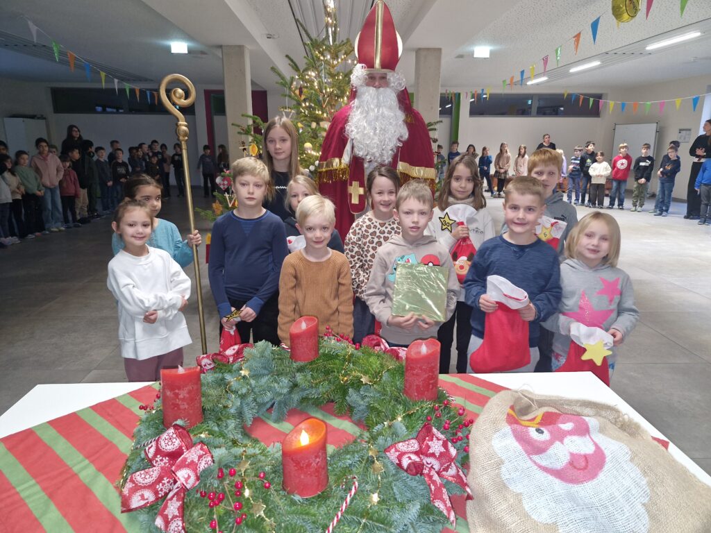 Zum 1. Dezember gab es beim heutigen Adventssingen eine ganz besondere Überraschung! Etwas früher als sonst stattete uns St. Nikolaus einen Besuch ab und sorgte so für leuchtende Kinderaugen. Um den selbst gesteckten Adventskranz (Danke an Frau Dietrich und ihre GTS-AG) und den schön geschmückten Weihnachtsbaum (Danke an Frau Gras und ihre GTS- AG) wurde gemeinsam gesungen und der Nikolaus hielt eine Rede. Jede Klasse erhielt traditionell ein lecker gefülltes Überraschungssäckchen. Das war ein schöner Start in die nächsten 3 Adventswochen und ein ganz besonderes 1. Adventstürchen.
